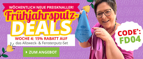 Im Gegensatz zu billigen Reinigungs- und Einwegprodukten aus dem Einzelhandel kannst du dich jetzt schon über einen langen Anwendungszeitraum meiner Produkte freuen. Ich selbst putze dank angemessener Pflege immer noch mit meinen ersten Lappen, die ich Anfang der 90er Jahre geschenkt bekommen habe. Diese Langlebigkeit sorgt nicht nur für Nachhaltigkeit, sondern vor allem auch für eine große Geldersparnis. Anstatt regelmäßig neue Tücher, Mopps sowie Reiniger zu kaufen, investierst du mit EASYCLEAN in dein langanhaltendes Putzvergnügen.