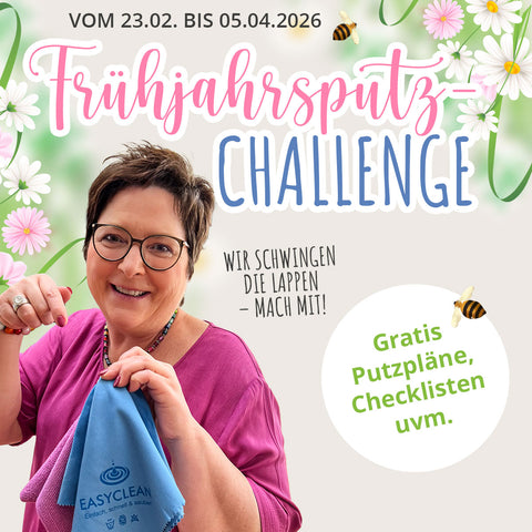 In der kostenlosen EASYCLEAN Frühjahrsputz-Challenge putzen wir vom 23.02. bis 05.04.2026 gemeinsam durch unser Zuhause – Schritt für Schritt. Mit wöchentlichen Aufgaben, Checklisten, Videos und viel Motivation weißt du genau, was wann zu tun ist und bleibst dran. Gemeinsam sorgen wir für sichtbare Fortschritte und starten entspannt in den Frühling.