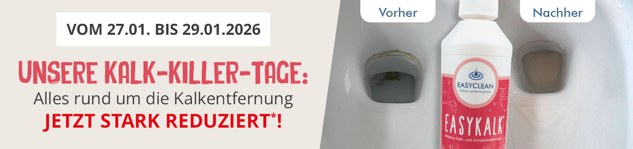 *Aktion gültig von 27.01. bis 29.01.2026. Nicht mit anderen Gutscheinen und Rabattaktionen kombinierbar. Nur gültig für die angezeigten Produkte der Seite https://www.easyclean-shop.de/collections/kalk-killer-tage. Keine Barauszahlung und Anrechnung auf die Versandkosten.