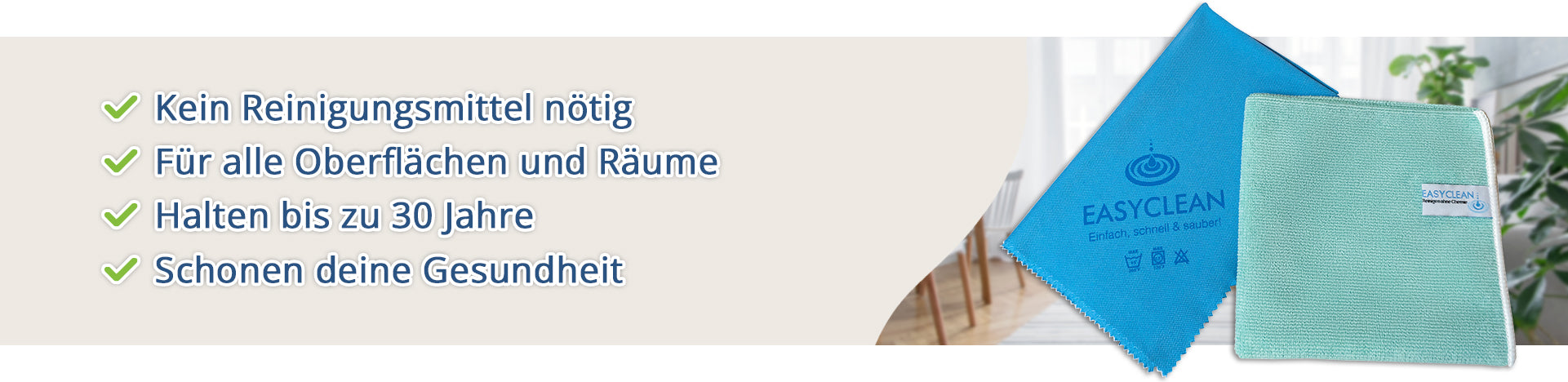 Umweltverträglichkeit: Das EASYCLEAN-Konzept setzt auf Nachhaltigkeit. Verabschiede dich von chemischen Reinigungsmitteln und diversen Produkten, die du ständig nachkaufen musst. Meine Fensterputztücher benötigen nur Wasser, um effektiv zu reinigen und halten bis zu 30 Jahre! Die Tücher sind also eine wahre Investition in ein langanhaltendes Putzvergnügen!