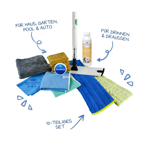 Dieses Set eignet sich für den Einsatz im ganzen Haushalt und darüber hinaus – vom Fensterputz bis zum Badezimmer, von der Küche bis zum Wohnzimmer, vom Boden bis zur Gartenbank. Egal, ob Flächen, Textilien, Glas, Möbel, Boden oder WC – hier steckt alles drin, was du für eine gründliche, chemiefreie Reinigung mit EASYCLEAN brauchst. Erlebe, wie du mit diesen wenigen, aber vielseitigen Putzhelden dein Zuhause im Handumdrehen auf Hochglanz bringst – nachhaltig, effektiv und mit richtig gutem Gefühl.