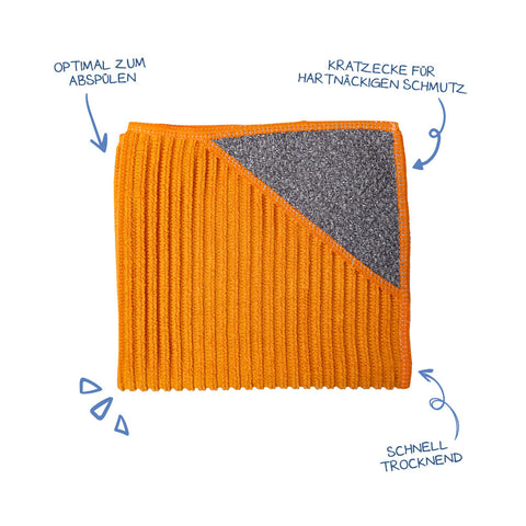 Natürlich ist das Tuch auch ein perfektes Spültuch für den Abwasch. Es reinigt kraftvoll Essensreste vom Geschirr. Natürlich kannst du mit diesem Spültuch auch alle Flächen in deiner Küche abwischen. Auch, wenn du deinen Esstisch sauber wischen möchtest und die Marmelade oder das Eigelb vom Frühstücken angetrocknet an der Tischplatte klebt, hast du gleich eine Kratzecke bei dir.